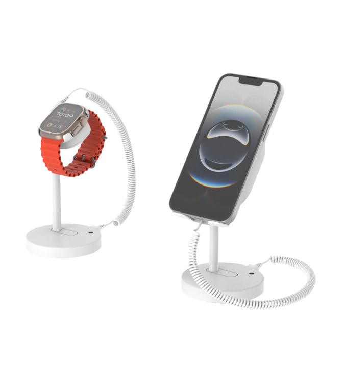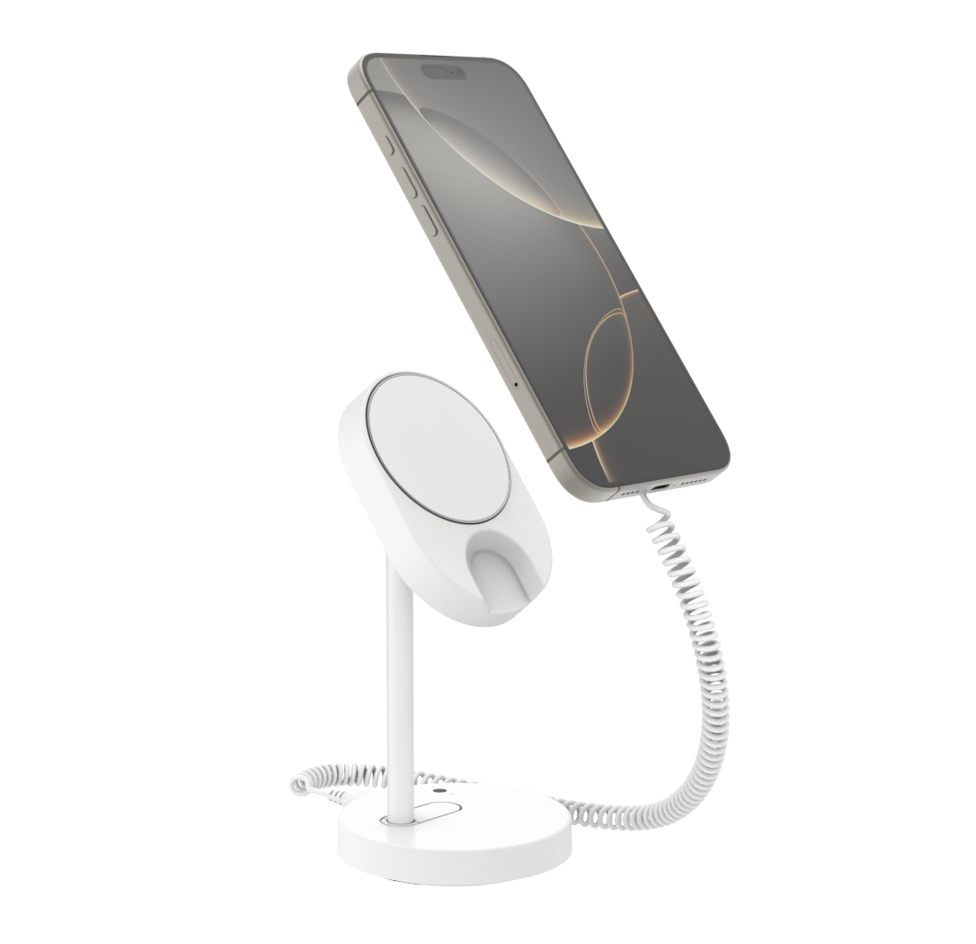MagStand progettato per l'esposizione di telefoni e dispositivi indossabili nei negozi al dettaglio e garantisce sia la ricarica che la sicurezza grazie al caricatore magnetico Qi2 InVue. Supporta dispositivi Qi2 e MagSafe.