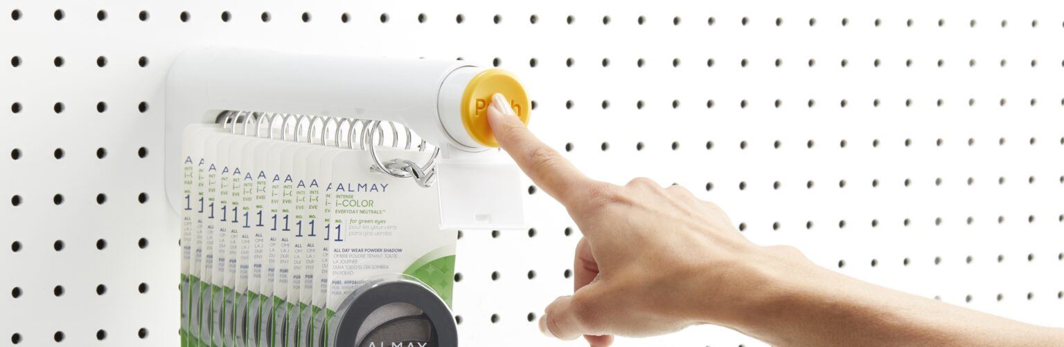 Il T1000 un sostituto 1:1 del gancio base per merce appesa. Si fissa a pannelli forati e pareti a doghe tramite una vite nascosta. Il distributore a molla con ritardo temporale è facile da rifornire per i commessi e distribuisce un solo prodotto alla volta premendo un pulsante. Le sue dimensioni ridotte massimizzano lo spazio sugli scaffali e possono essere facilmente spostate per un rapido riassortimento.