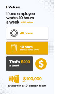 I dipendenti del settore retail dedicano oltre il il 25% della loro settimana lavorativa in attività ripetitive. I manager? Fino al 60% del loro tempo è dedicato a lavori che non generano entrate. Se un dipendente lavora 40 ore alla settimana a 20 dollari l'ora e spreca 10 ore in lavori di scarso valore, si tratta di 200 dollari alla settimana, ovvero 100.000 dollari all'anno per un team di 10 persone.